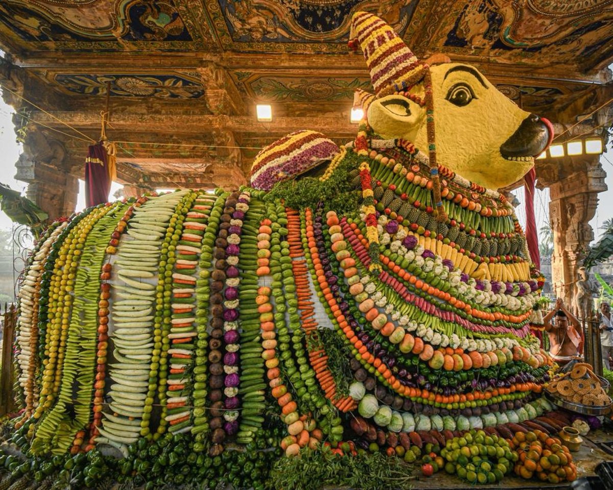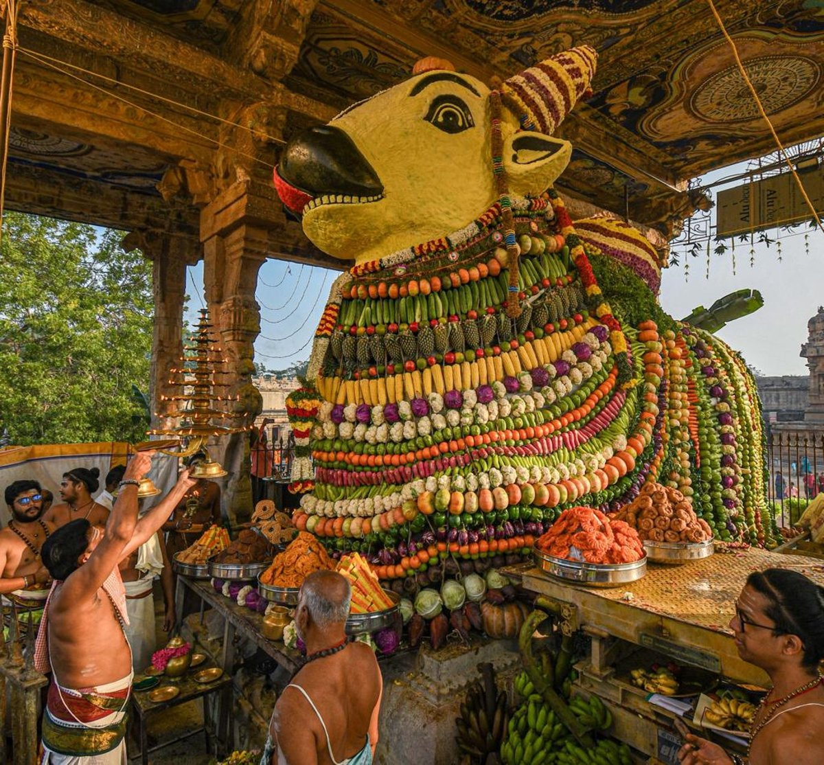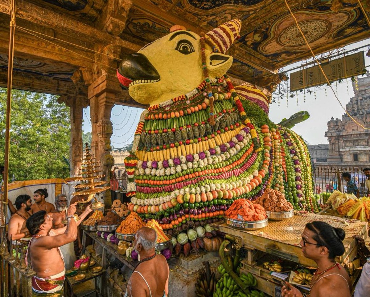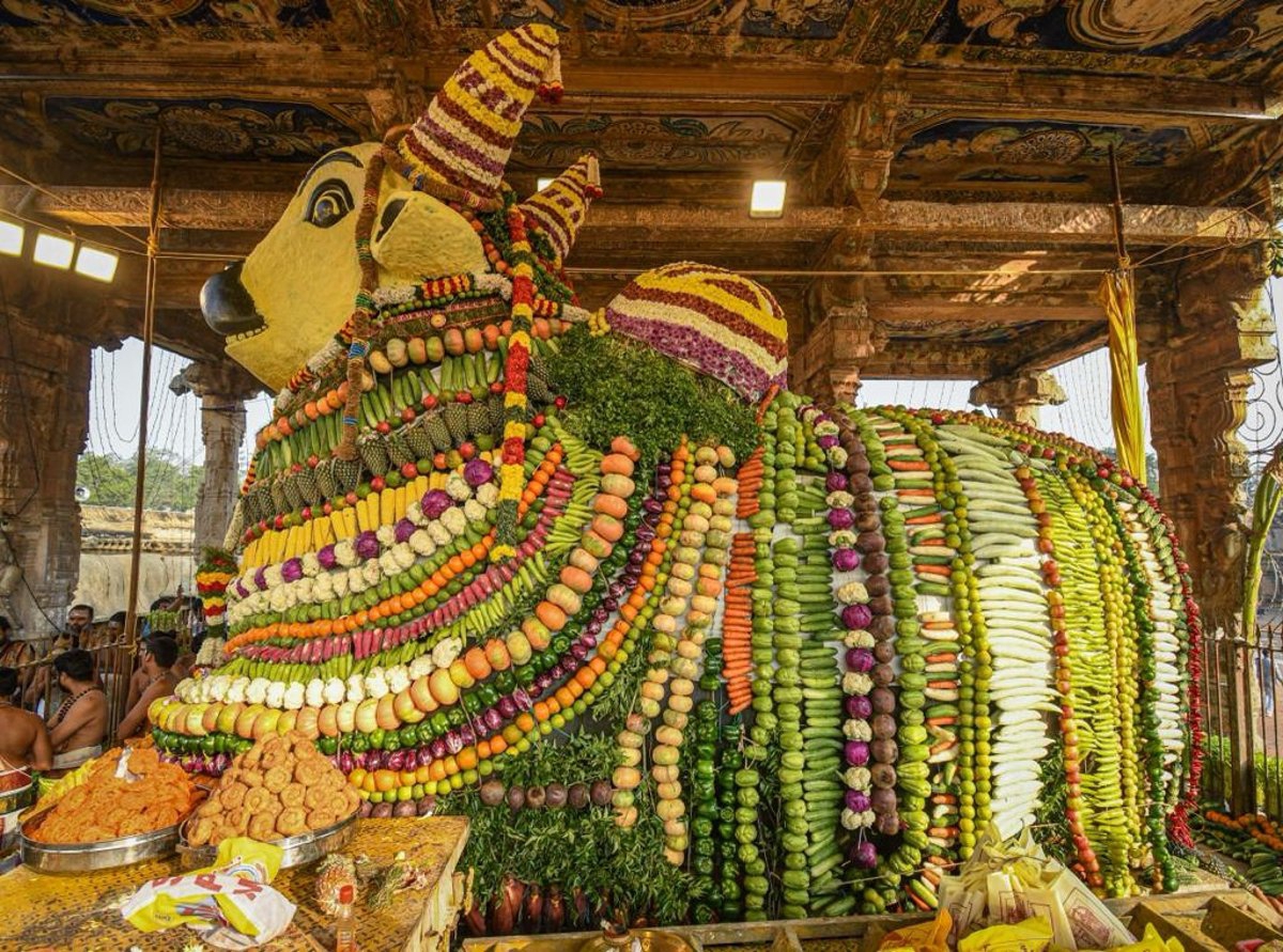 கண்கொள்ளா காட்சிகள்... 2,000 கிலோ காய், கனிகள்... தஞ்சை நந்தி பெருமானுக்கு சிறப்பு அலங்காரம்!