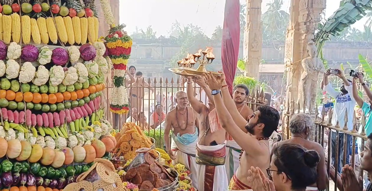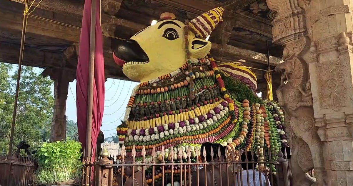 மாட்டுப்பொங்கலை முன்னிட்டு தஞ்சை பெருவுடையார் கோயில் நந்தியம்பெருமானுக்கு 3 டன் எடையிலான காய்கறிகள், பழங்கள், இனிப்புகள் கொண்டு சிறப்பு அலங்காரம் செய்யப்பட்டு மகா தீபாராதனை காண்பிக்கப்பட்டது.