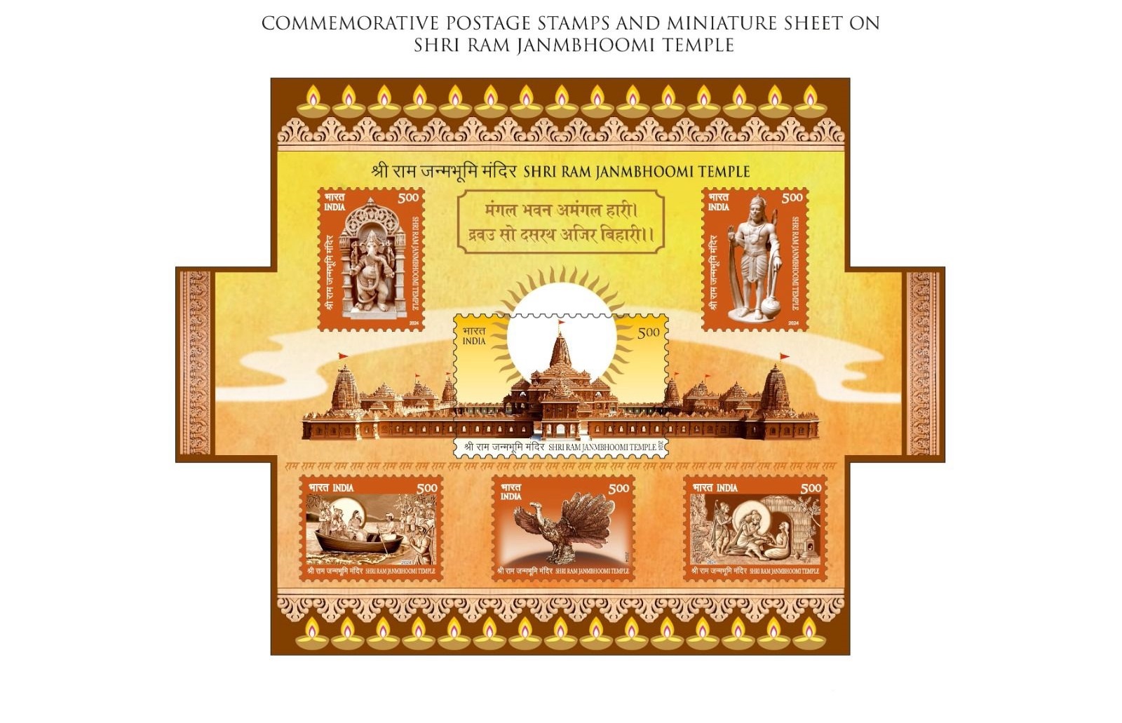 அயோத்தி ராமர் கோயில், மங்கள் பவன் அமங்கல் ஹரி, பிரகாசிக்கும் சூரியன், புனித சரயு நதி, கோயிலில் காணப்படும் சிற்பங்கள் உள்ளிட்ட 6 தபால் தலைகள் வெளியிடப்பட்டுள்ளன.