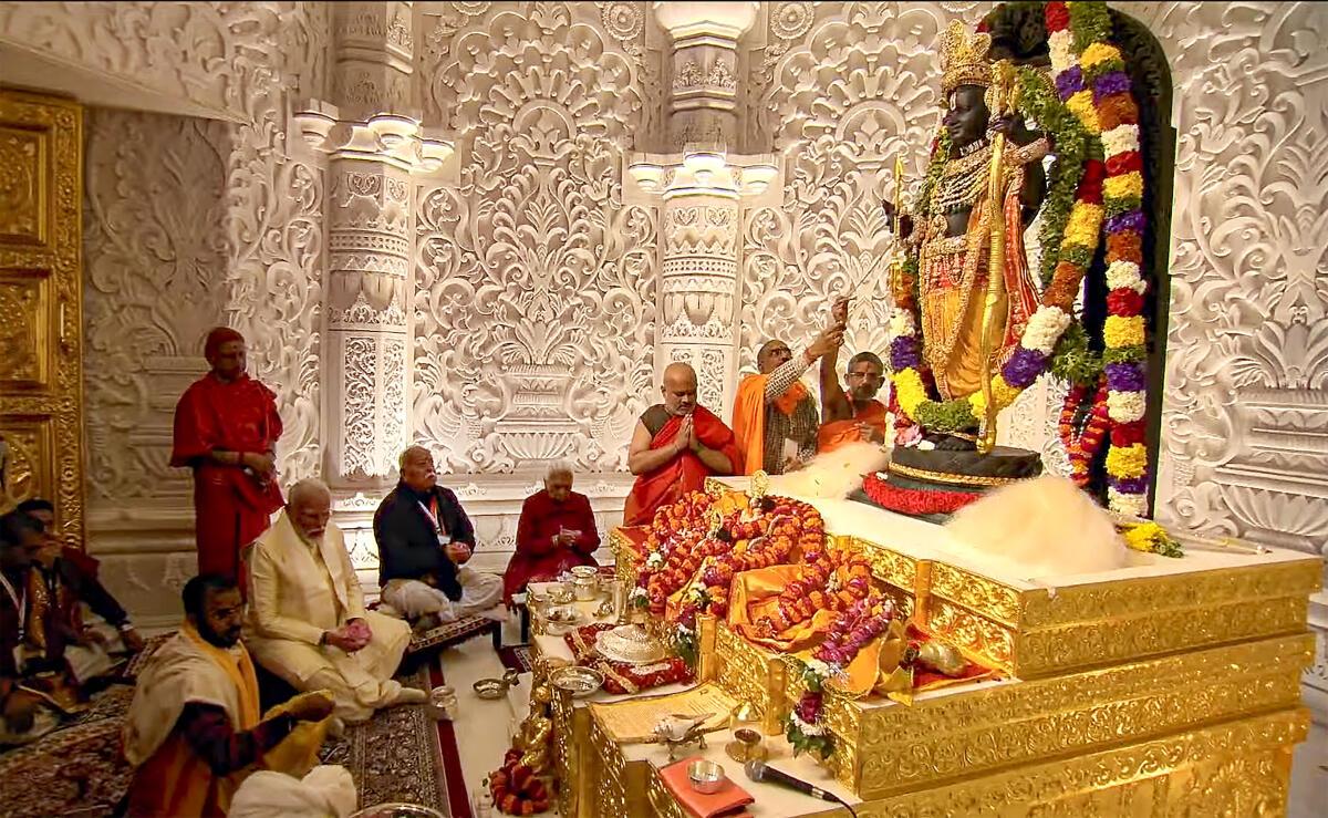 கருவறை அருகே உள்ளே வந்த மோடியுடன், ஆர்எஸ்எஸ் தலைவர் மோகன் பகவத் உடன் அமர்ந்தார். மோடி சங்கல்பம் செய்து கொண்டார். சரியாக 12.20 மணிக்கு கோயிலின் கருவறைக்குள் நுழைந்த மோடி மற்றும் மோகன் பகவத் இருவரும் குழந்தை ராமர் சிலையின் எதிர்புறம் அமர்ந்து அங்கு நடைபெற்ற பூஜைகளில் கலந்து கொண்டனர்.