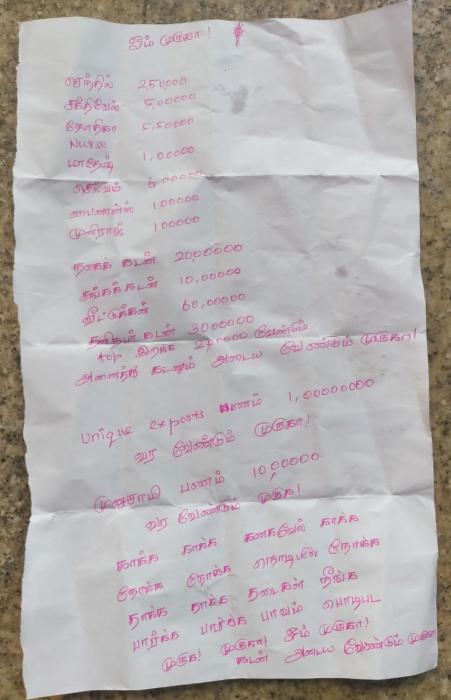 கடன் கொடுக்க வேண்டிய நபரின் பெயரும், தொகையும் வரிசையாக எழுதியுள்ளார். அதில், மொத்தமாக 1 கோடியே 43 லட்தத்து 50 ஆயிரம் கடன் கொடுக்க வேண்டும் என்றும், இந்த கடன் அனைத்தும் விரைவில் அடைய வேண்டும் என்றும், தனக்கு சிலரிடம் இருந்து வர வேண்டிய ரூ.10 கோடியே 10 லட்சம் விரைந்து வர வேண்டும் என்றும் குறிப்பிட்டுள்ளார்.